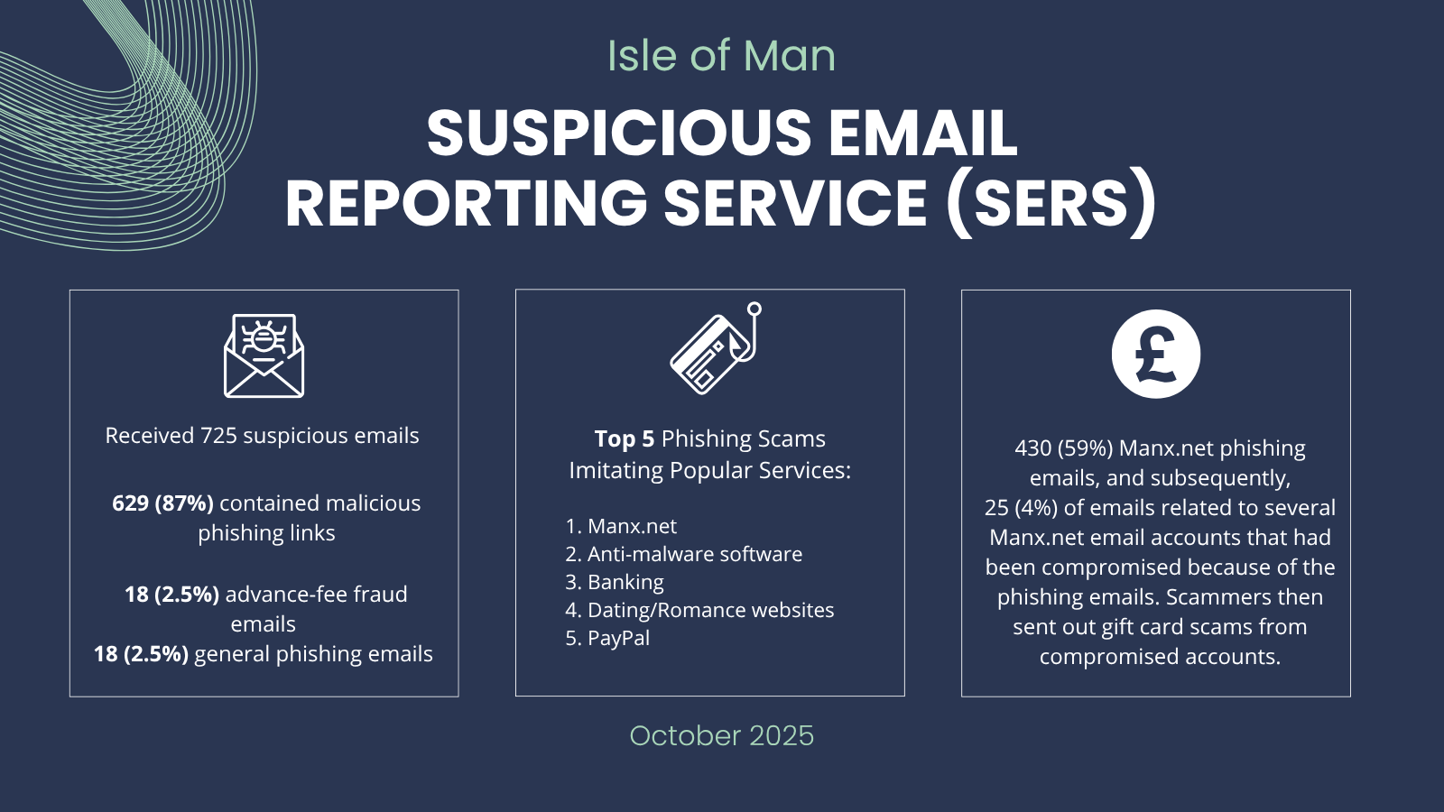 In October 2025, we received 725 suspicious emails. For more statistics, please take a look at our SERS Statistics: 1 October 2025 – 31 October 2025 infographic or view the text version at the bottom of this page.