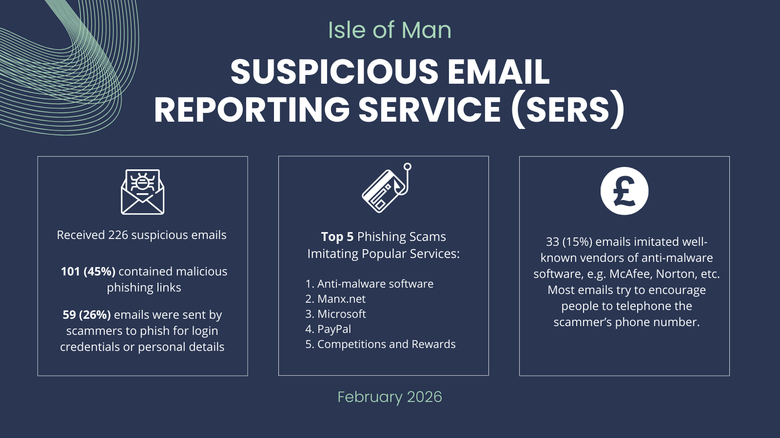 In February 2026, we received 226 suspicious emails. For more statistics, please take a look at our SERS Statistics: 1 February 2026 – 28 February 2026 infographic or view the text version at the bottom of this page.