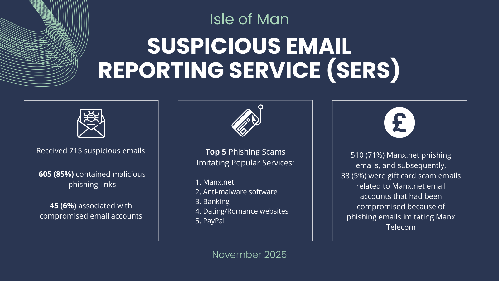 In November 2025, we received 715 suspicious emails. For more statistics, please take a look at our SERS Statistics: 1 November 2025 – 30 November 2025 infographic or view the text version at the bottom of this page.